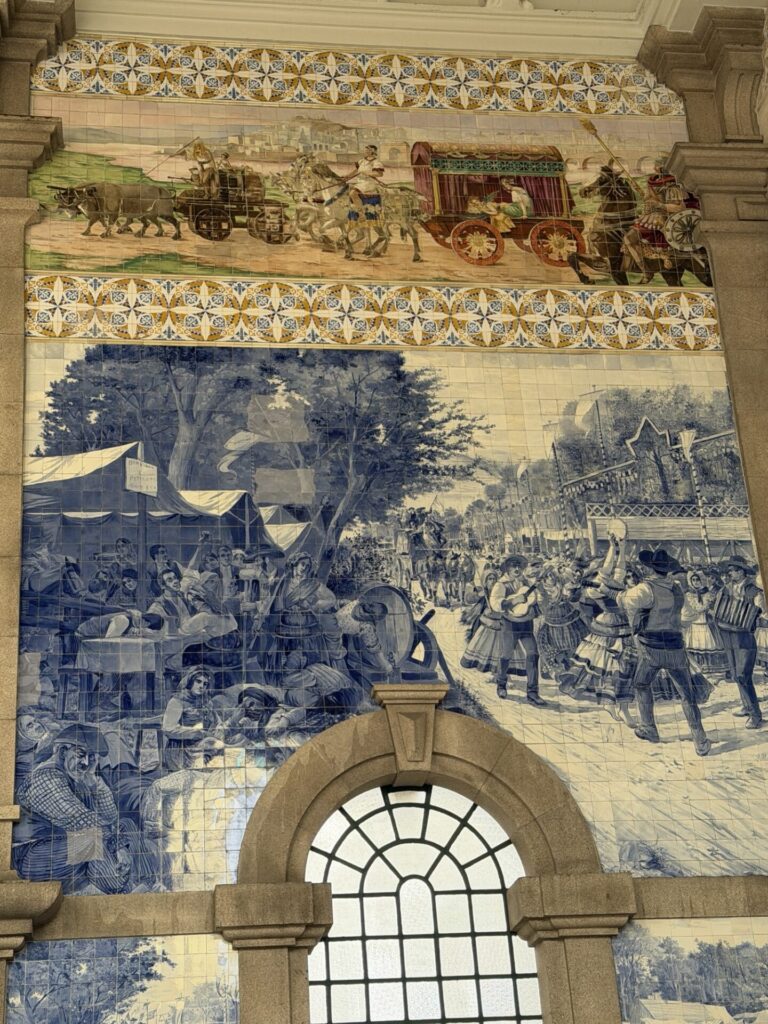 We went into São Bento Station, which is one of the highlights of the day. Inside, the walls are covered in blue and white tile murals showing scenes from Portuguese history. It’s far more than just a train station, you end up standing there taking it all in.